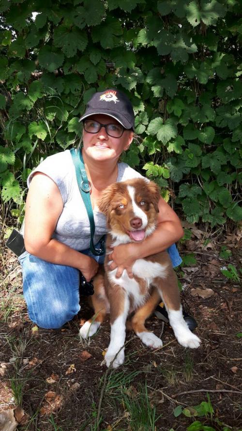Heute kam mein neues Frauchen nach Gießen um mich abzuholen. Sie brachte auch noch eine neue Hundefreundin für mich mit. Die mochte ich von Anfang an, die Piper. Unser Aufeinandertreffen verlief ohne Probleme. Mein neues Frauchen blieb ein paar Tage um mit meiner Züchterin ein bisschen Zeit zu verbringen. Wir haben so einige Sachen zusammen erlebt. So waren wir am See plantschen und haben ein Tiergehege besucht, wo ich viele große Tiere kennen gelernt habe. Es war sehr aufregend. Dann hieß es Abschied nehmen von meinem Schwesterchen und meiner Ziehmama. Wir waren nochmal alle zusammen Gassie, war supi. Dann ging es auf große Fahrt. Es waren so ca 600km. Leider vertrug ich am Anfang das Autofahren nicht so gut und mir wurde übel. Aber jetzt geht das prima, mir wird nicht mehr schlecht und das Autofahren klappt auch immer besser. Im neuen Zuhause hab ich mich auch gleich wohl gefühlt. So nun ein paar Bilder.